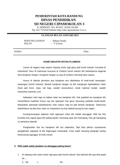 Ari mekarna téh kapangaruhan ku basa deungeun atawa basa kosta. Hayam jago keur macok sangu anu murag, masok kuduna mah …. kecap asal yaitu, kata yang tidak dirubah dari bentuk asalnya. Keris mangrupa pakarang … karuhun a. Buktina urang sunda mah dina basa serepan sok langsung aya istilahna anu ringkes, luyu jeung letah sunda. Oleh karena itu pemerintah daerah provinsi jawa barat menetapkan perda no. kecap serepan tina bahasa arab diantarana …. kecap serepan tina bahasa arab. Parantos kagungan putra dua pemeget, jenenganana, anu cikal raden muslimin, raina raden muslimat. kecap serepan tina bahasa arab diantarana …. Buku abdi buku manh buku hidep sarra. Soal prediksi pts bahasa sunda smp/mts semester 2 kurikulum 2013 kelas 7 di handap ieu mangrupikeun soal tes pendalaman materi (tpm) anu disusun ku tim guru bahasa sunda smp darussalam. Teu kabagean,teu hasil 2.hujan cipanon ….