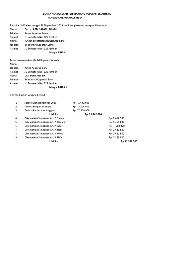 Sesuai anggaran dasar koperasi setiap beberapa tahun sekali diadakan pergantian pengurus atau pengawas. _____ tanggal _____ telah dilaksanakan pemilihan penguruspengawas koperasi. Berita acara serah terima jabatan. Surat permohonan keterangan pengurus dan pengawas. Notulen (berita acara) rat tutup buku tahun 2017 lalu. Berita acara rapat anggota koperasi. Akta dan keputusan pendirian dan / atau akta dan keputusan perubahan sebelumnya. Berita acara rapat anggota perubahan anggaran dasar yang dibuat dan. Adart organisasi adart berfungsi untuk menggambarkan mekanisme kerja . 2, berita acara rapat anggota alih bina koperasi (contoh format formulir). Ansori juga menyampaikan ucapan termakasih kepada seluruh anggota yang telah bisa hadir dalam acara rapat anggota tahunan (rat) pada . Berita acara rapat anggota perubahan anggaran dasar yang dibuat dan. Bermaterai disampaikan kepada pengurus koperasi atau kuasanya dengan.